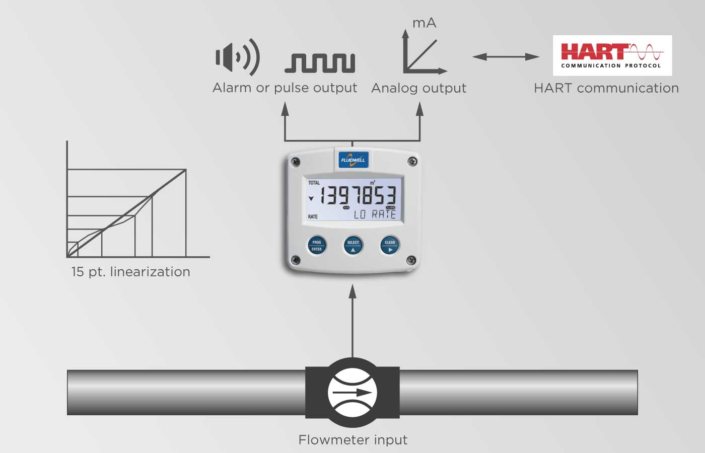 • Zeer diverse montagemogelijkheden: muur, pijp, paneel -montage of rechtstreeks op de flowmeter